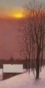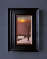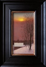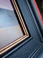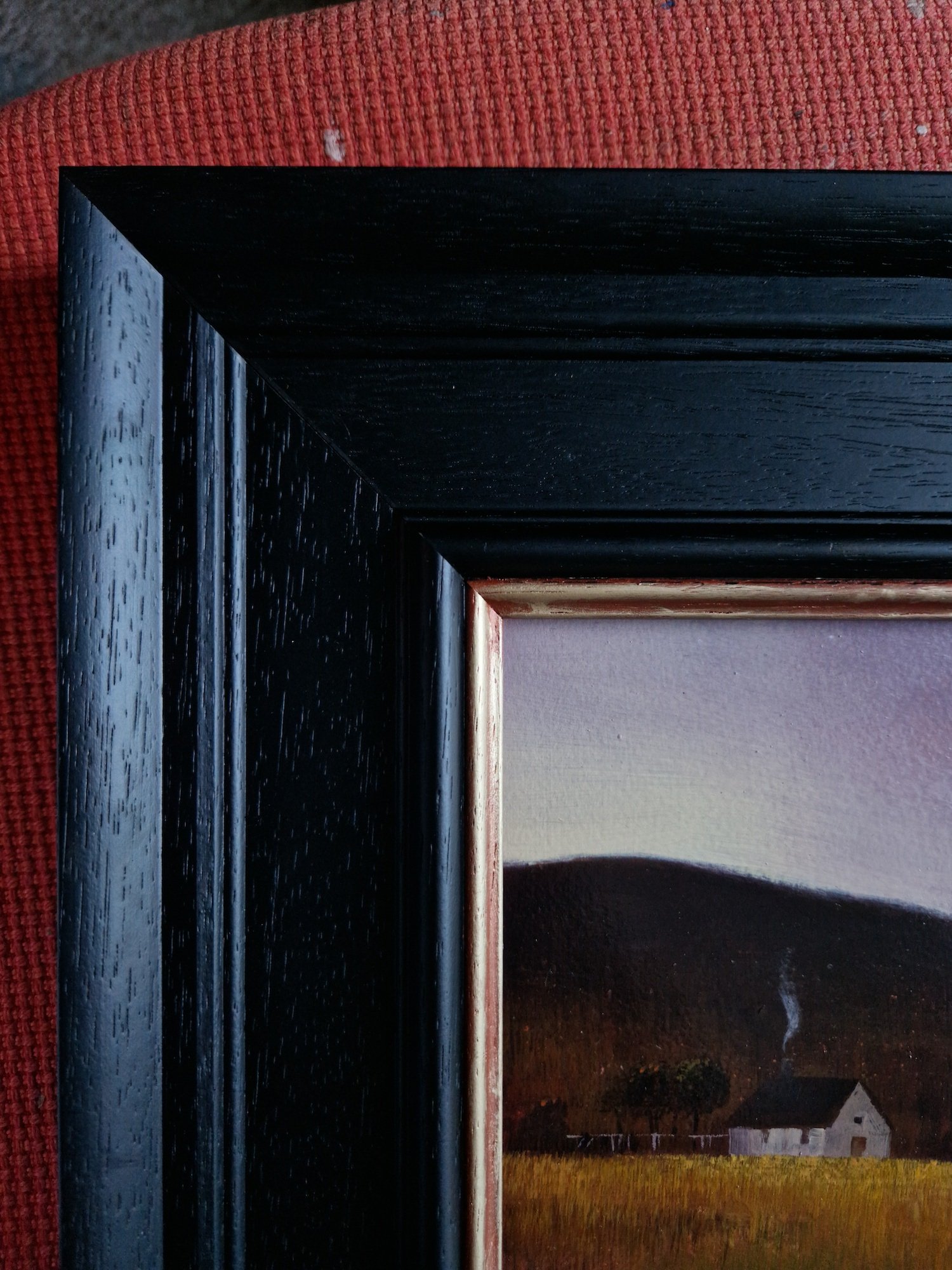 Framed and ready to hang in a beautiful black frame with a scooped profile and an antique gold rim on the inner edge closest to the painting. Protective glass glazing is included.